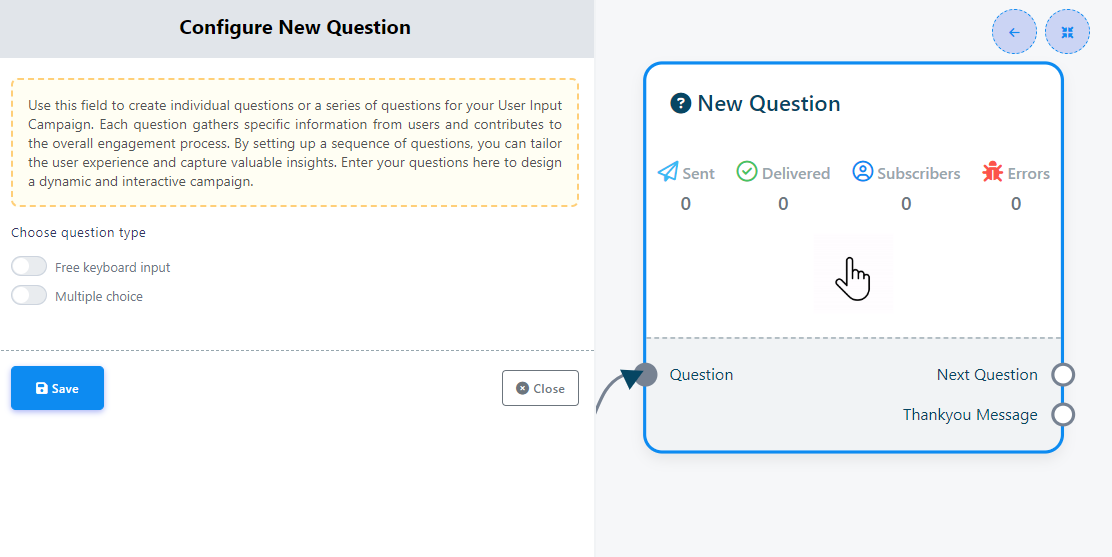 4. Double-click on the `New Question` component to access two buttons: `Free Keyboard Input` and `Multiple choice`. These buttons determine the type of questions you want to ask.